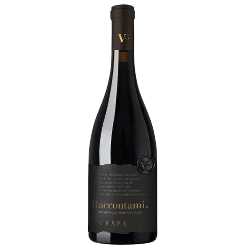 De Primitivo di Manduria DOC “Raccontami” van Vespa Vignaioli per Passione combineert het krachtige Zuid-Italiaanse karakter met een weelderige elegantie dankzij 12 maanden rijping op Franse barriques. Hij opent met intense aroma’s van rijp zwart fruit en specerijen, gevolgd door een volle smaak met zachte tannines en een lange, uitstekende afdronk.